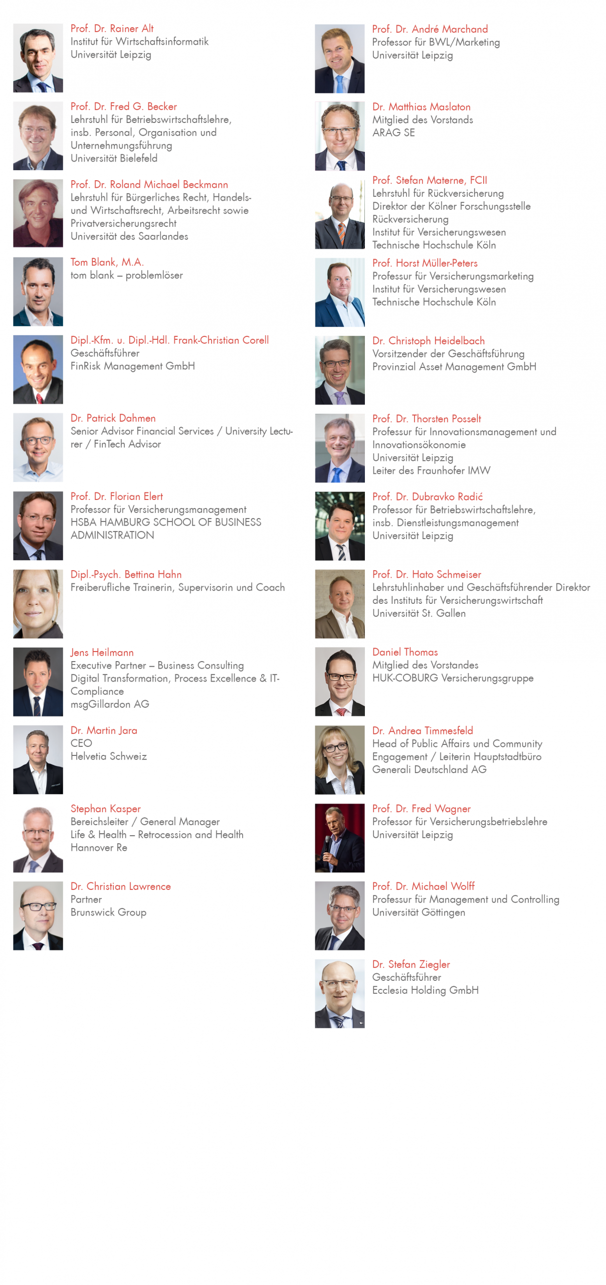 Das Dozententeam setzt sich aus renommierten Wissenschaftlerinnen und Wissenschaftlern und erfahrenen Führungskräften der Versicherungswirtschaft und anderen Finanzdienstleistungsbranchen zusammen. Die wissenschaftlichen Dozentinnen und Dozenten weisen allesamt eine hohe fachliche Kompetenz und umfangreiche Lehrerfahrungen auf, und sie haben sich durch Publikationen in ihrem jeweiligen Fachgebiet ausgezeichnet.